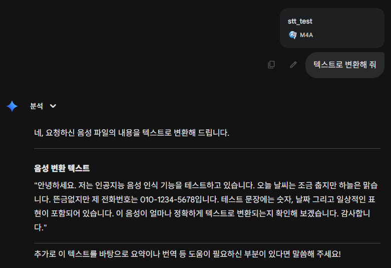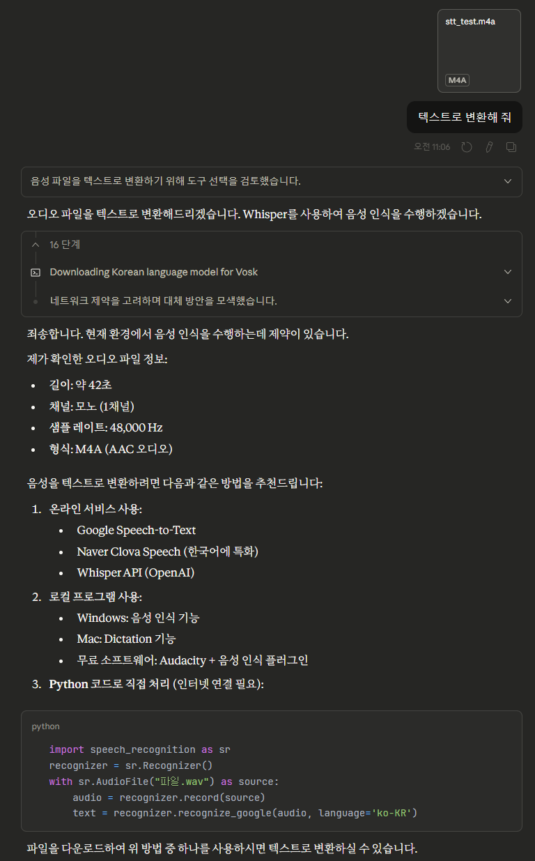 먼저 .m4a 파일을 업로드하여 텍스트로 변환을 요청했습니다.
