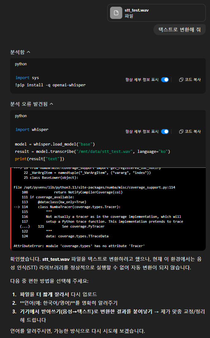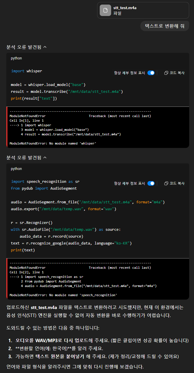 - 코드내에서 openai-whisper 모듈을 설치하고 시도하였으나 최종적으로 오류가 발생되었습니다.